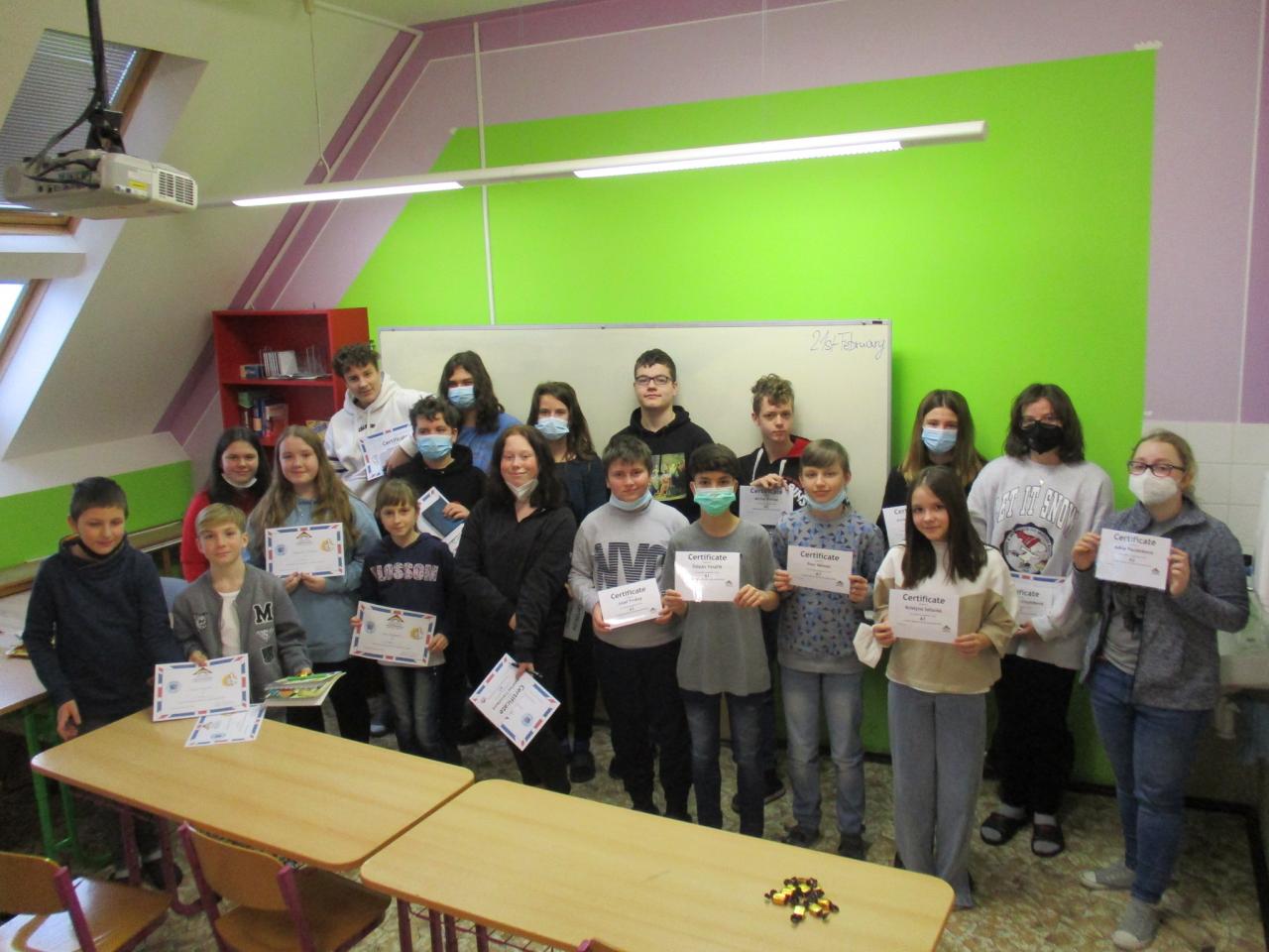 Za kategorii 6. a 7. ročník se anglické olympiády zúčastnilo celkem 8 žáků. Z šesté třídy to byli: Petr Němec, Štěpán Jedlička a Kristýna Selucká, ze sedmé třídy pak: Josef Trněný, Kateřina Trávníčková, Amálie Ema Chudobová, a dokonce přišli i ti, co mají angličtinu jako druhý jazyk, a to: Štěpán Tesařík a Anička Harenčáková. Všem patří dík za odvahu a za účast, všichni se snažili a byli šikovní. Na třetím místě skončil Štěpán Jedlička, druhá skončila Amálie Ema Chudobová a na prvním místě Kateřina Trávníčková, která postupuje do okresního kola.