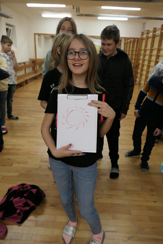 Taky jsme byli pochváleni za dobrý tým, který umí spolupracovat. Třeba kreslení prstem na záda jako tichá pošta bylo docela legrace! Jedno družstvo místo domku vykouzlilo na konci kytku. Ale taky dobrý obrázek.