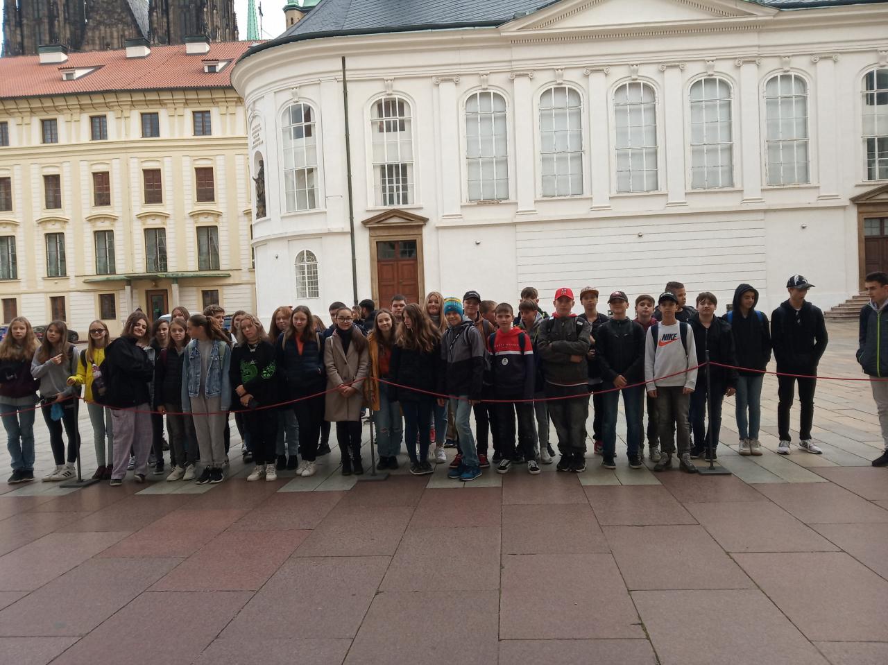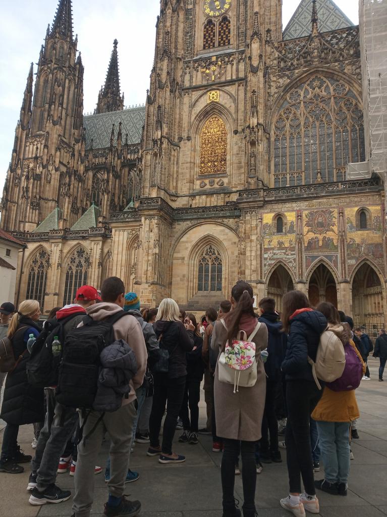 Bohužel katedrála svatého Víta byla ten den uzavřena, takže se museli spokojit pouze s pozorováním nádherného opěrného systému s fiálami či chrliči po obvodu střechy. Zpestřením programu byla slavnostní výměna hradní stráže.