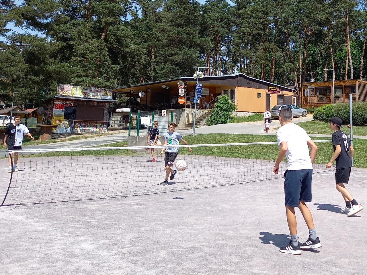 Celé odpoledne bylo věnováno sportovním aktivitám – přehazované, nohejbalu, ale i jízdě na šlapadlech po vodní hladině. Sluníčko vytrvale svítilo, tak se hry přesunuly i do vody. A protože nám hodně vytrávilo, řízek s brambory jsme si dali s opravdovou chutí. Během večera jsme pak zpívali různé písničky s kytarovým doprovodem p. uč. Leischnera. Moc rád si s námi zazpíval i pan majitel Jiří Sobol. Večerka byla trochu později, ale ráno přišli všichni na snídani včas.
