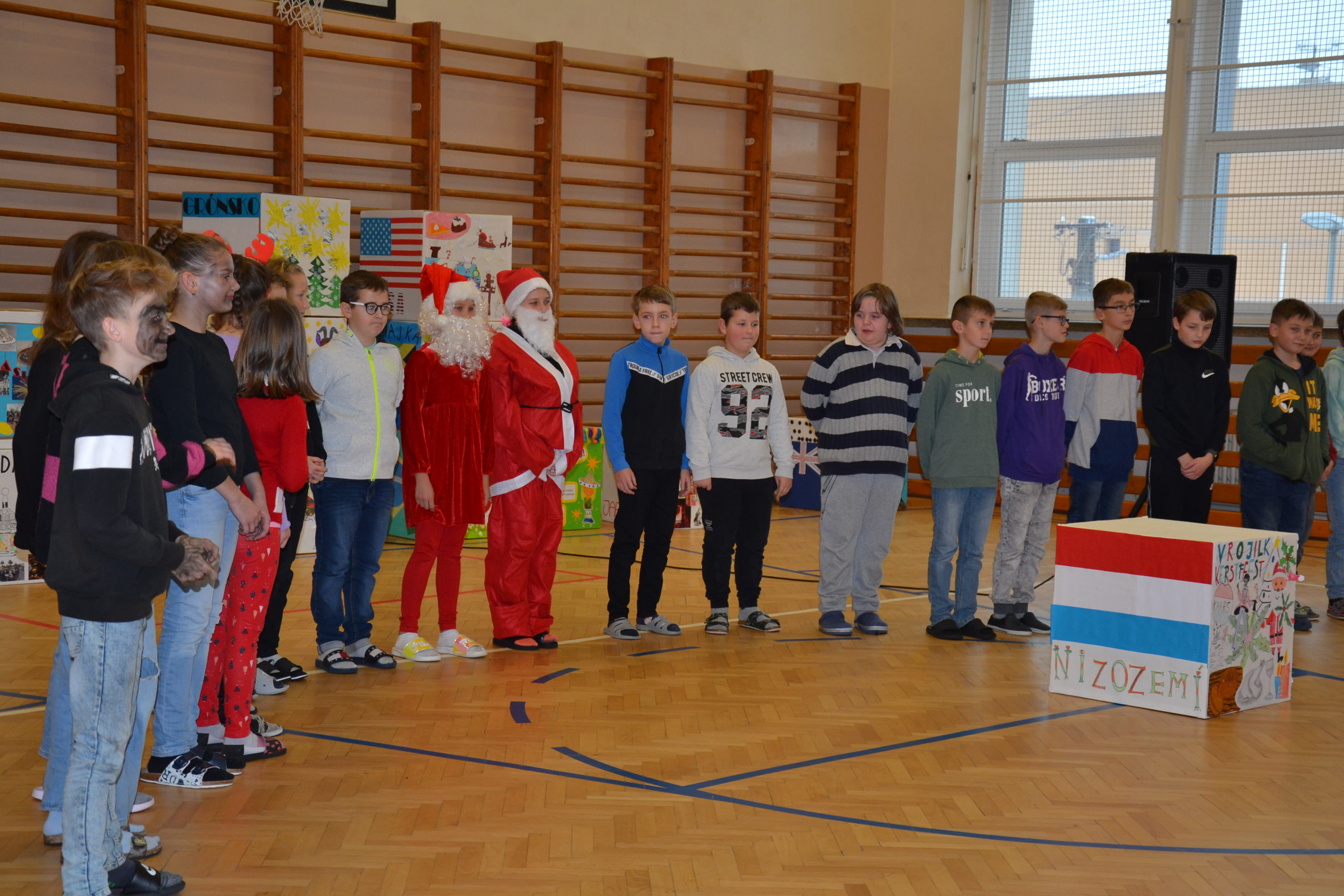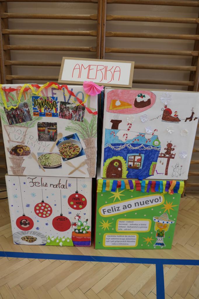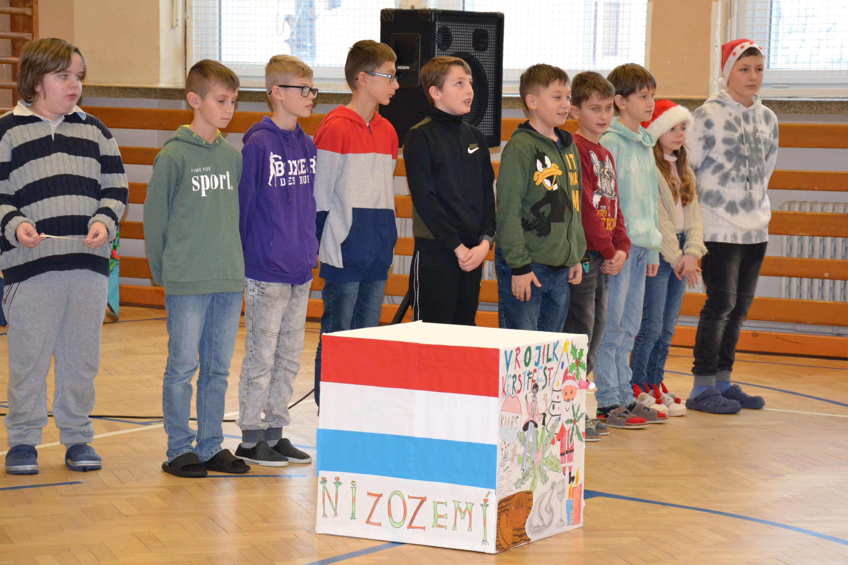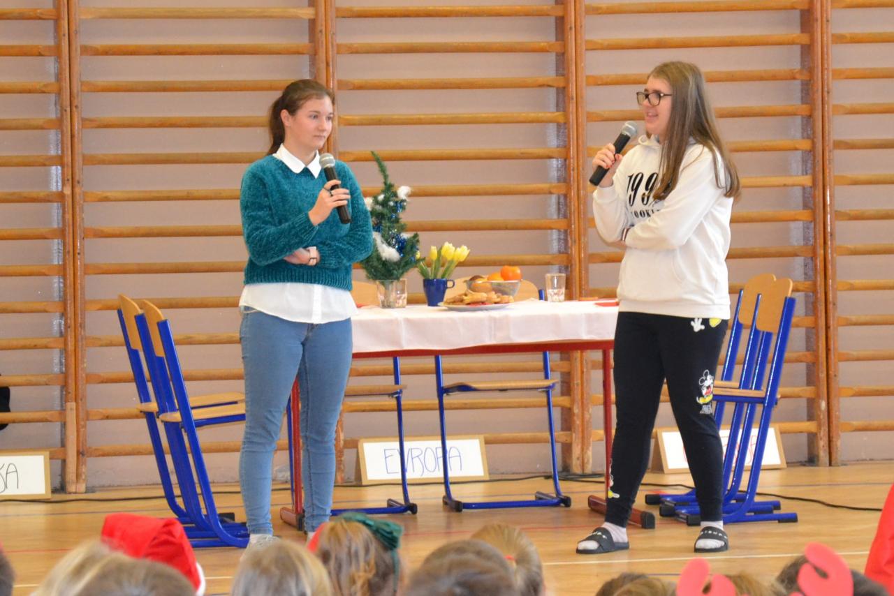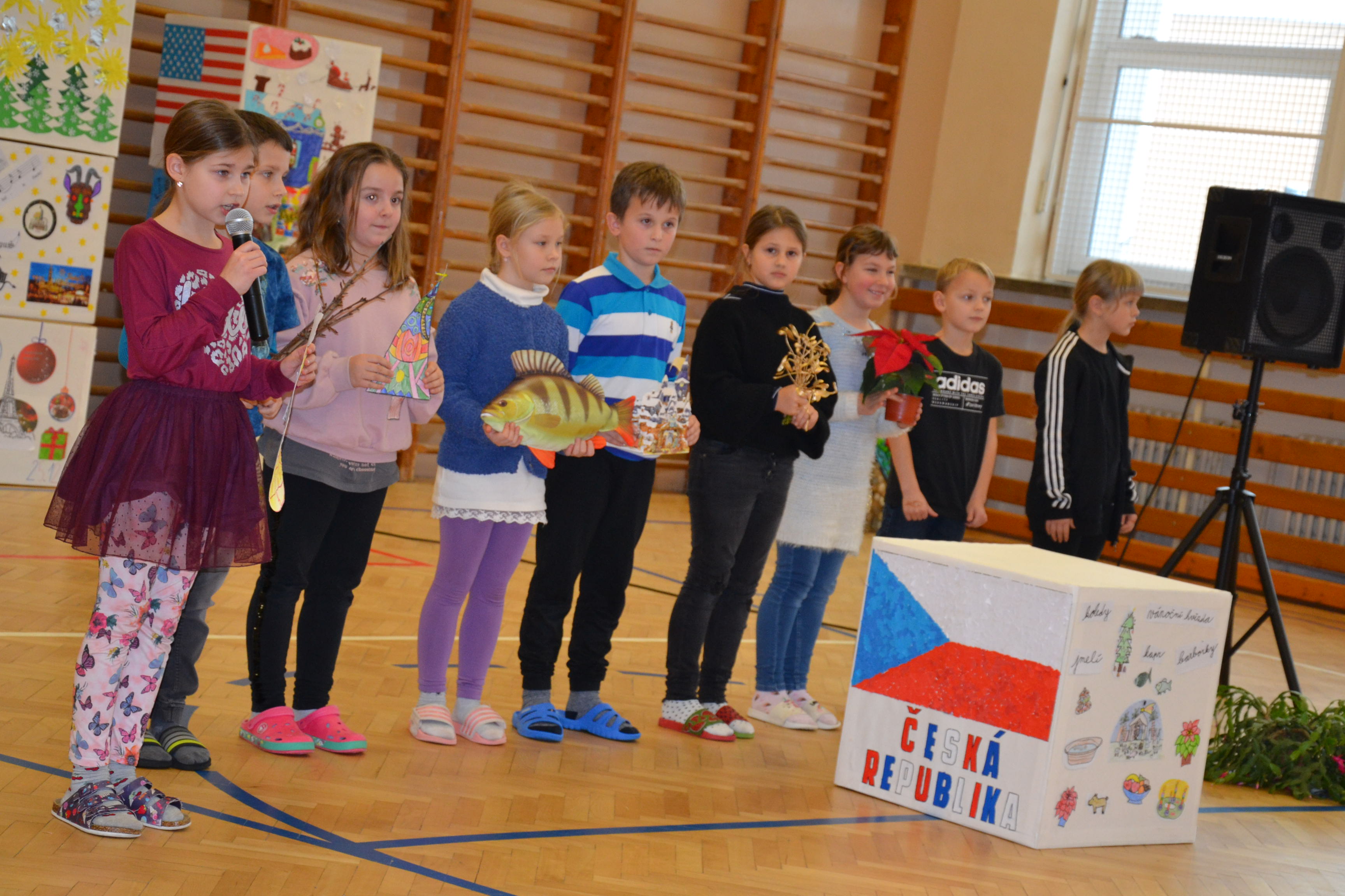 Žáci druhých tříd (2. A a 2. B) připomněli, že na Slovensku se Vánoce slaví podobně jako v ČR, menší rozdíly najdeme hlavně u štědrovečerní tabule, kdy nechybí placka s medem, kapustnica a opékance.