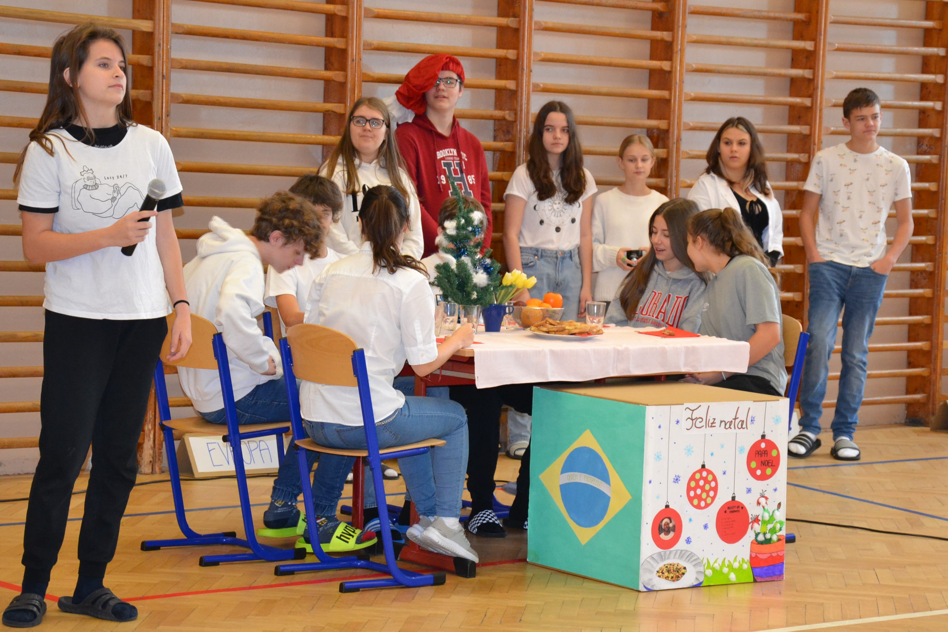 Jihoamerická Brazílie (9. B) slaví Štědrý večer - 24. prosince – jako rodinné setkání a nekonečnou hostinu. Hlavním vánočním jídlem je pečený krocan, jako dezert se podávají sladké dorty s kokosem nebo banánem, brazilský domácí puding a typické Panettone - sladký chléb. Dárky nosí dětem v Brazílii Papai Noel a rozdávají se o půlnoci.