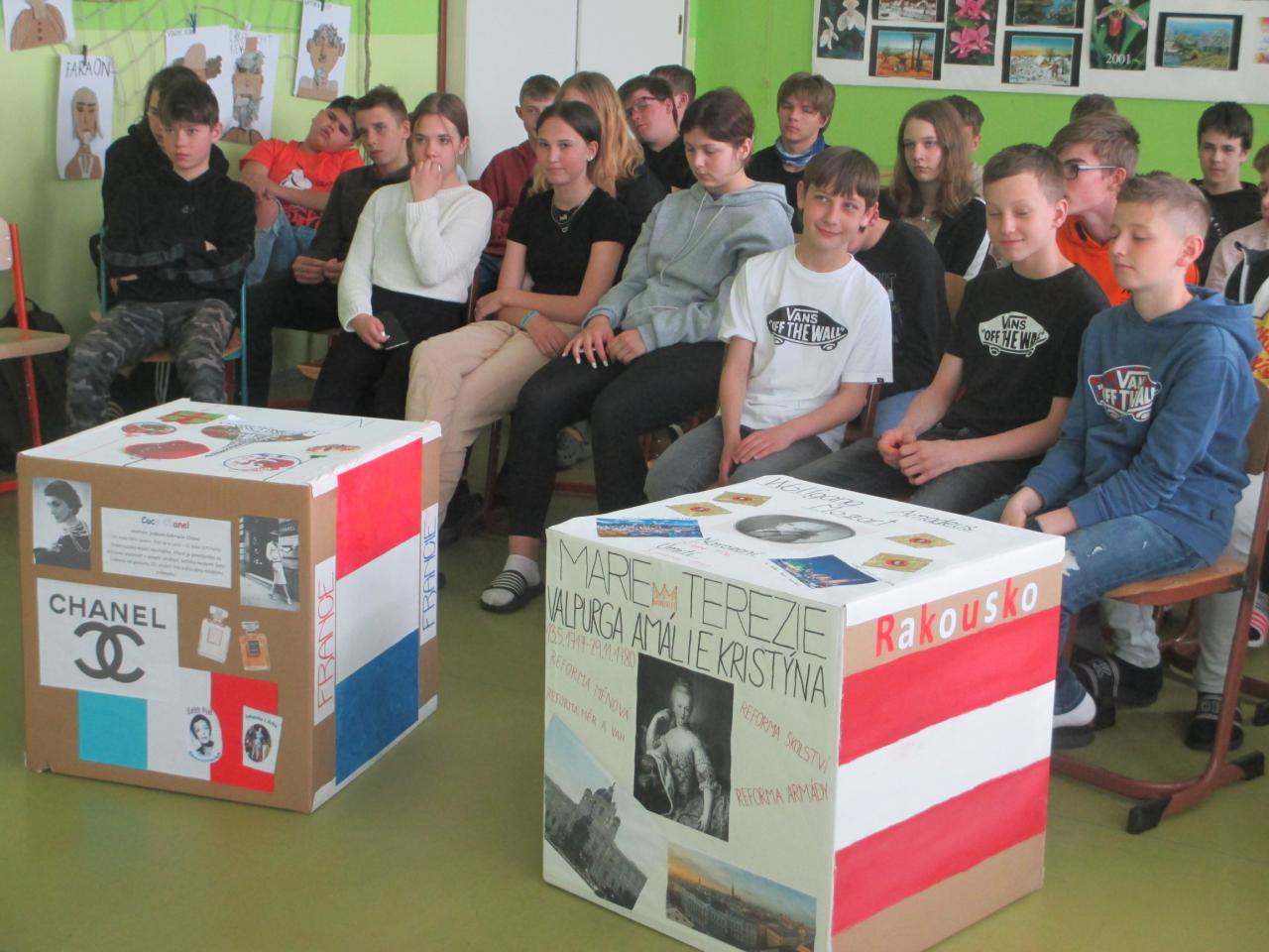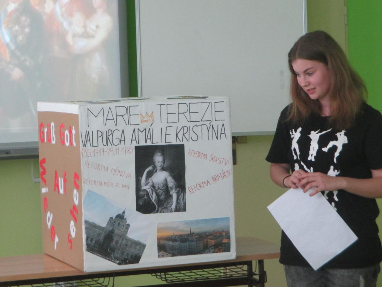 7. B se věnovala nejznámější panovnici Rakouska Marii Terezii a jejím reformám, zejména reformě školství. Mužské osobnosti pak zastupoval hudební skladatel období klasicismu a klavírní virtuóz Wolfgang Amadeus Mozart. Na závěr jsme si vyslechli krátkou ukázku Malé noční hudby od W. A. Mozarta a ukázku francouzského šansonu v podání další významné francouzské osobnosti Edith Piaf.
