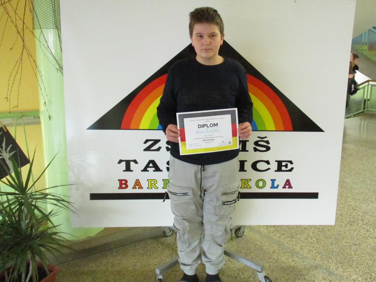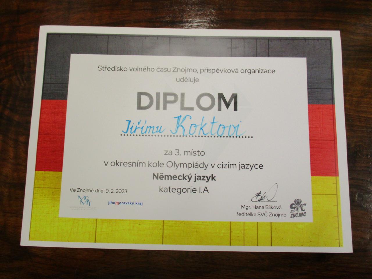 Ve čtvrtek 9. 2. 2023 proběhlo ve Znojmě okresní kolo soutěže v německém jazyce. Naši školu v kategorii I A reprezentoval Jiří Kokta, který obsadil krásné 3. místo