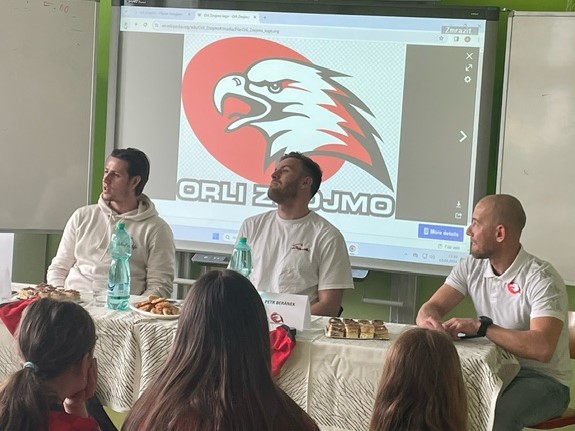 Ve středu 3. dubna k nám přilétla vzácná návštěva ze Znojma. A proč přilétla? Nenavštívil nás nikdo jiný než trojice hokejistů – Znojemských orlů, jmenovitě Radim Matuš a Petr Beránek. Díky Nikče Růžičkové z 9. B a jejímu hokejovému tématu absolventské práce přijali