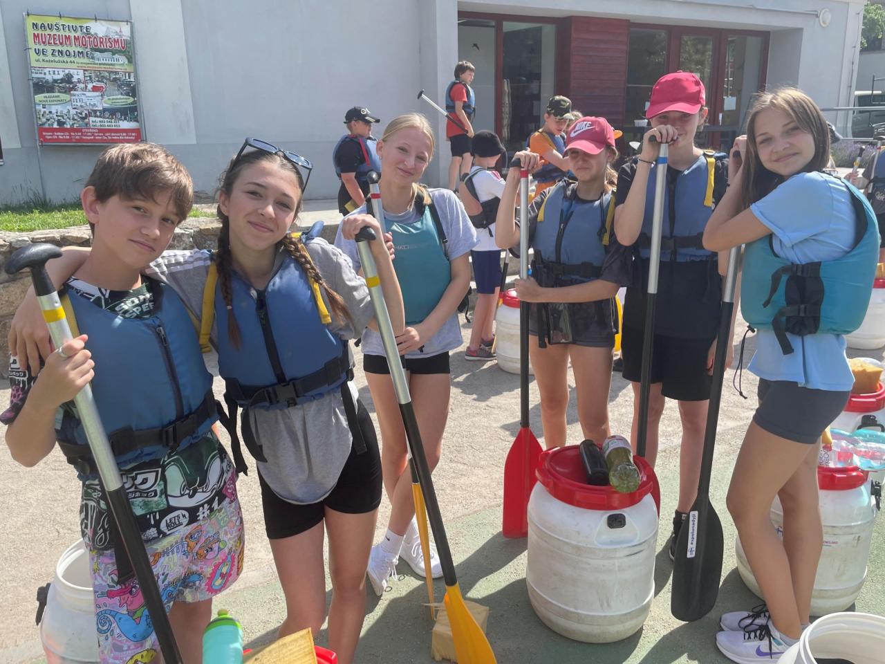 Vodácké ahoj si řekli v pátek 14. června šesťáci, když sjížděli řeku Dyji. Trasa ze Znojma do Tasovic byla pro některé zkušené vodáky hračkou, avšak pro začátečníky velkou výzvou. Přesto všichni téměř dvanáctikilometrovou plavbu zvládli na jedničku!
