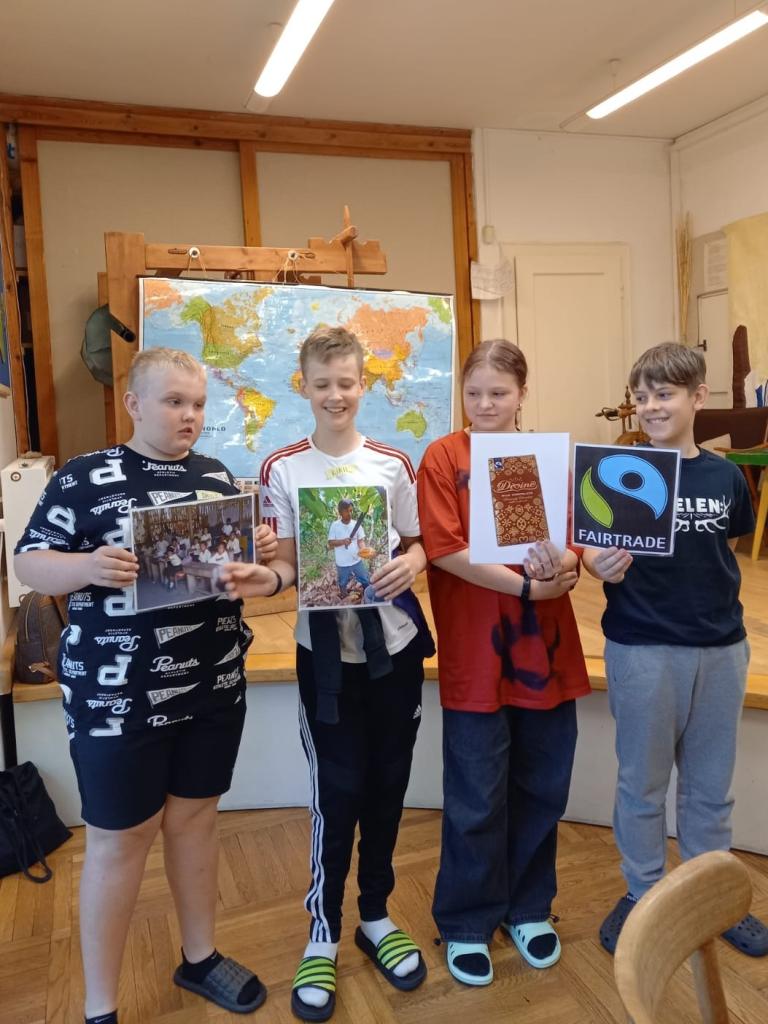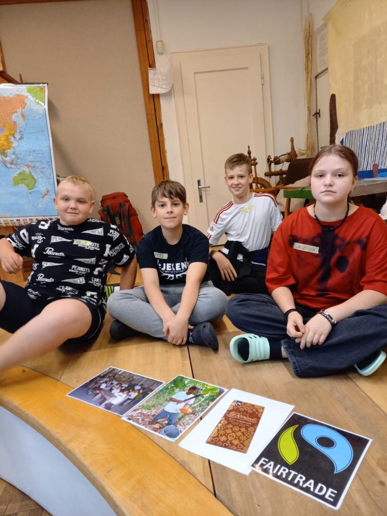 V úvodní části programu Cesta do Ekvádoru se žáci 6. B seznámili se životem lidi v této zemi. Ve skupinách zjišťovali, co se kde pěstuje. Konkrétně jak se banány a kakaové boby pro výrobu čokolády dostanou až k nám a co vše je k jejich přepravě potřeba. Nechyběla ani ochutnávka drcených kakaových bobů.