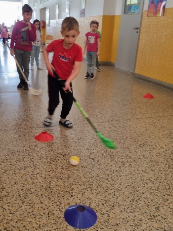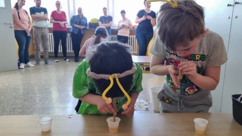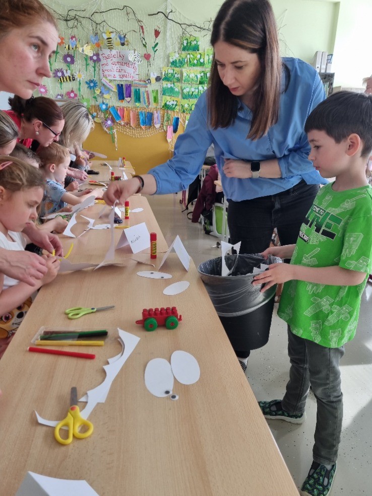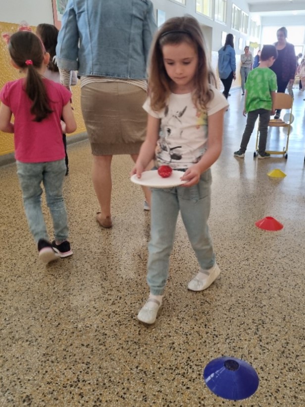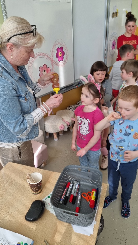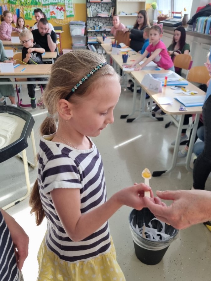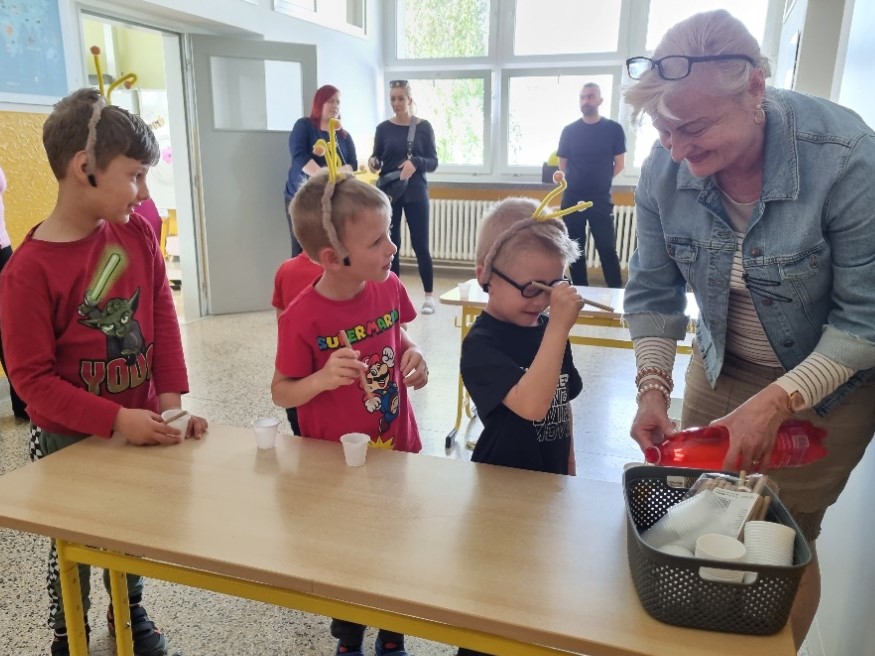 Na procvičování hrubé motoriky na děti čekala čtyři stanoviště. Jedním z nich bylo přenášení nektaru pomocí slánek do pomyslných úlů. Závěrem děti ochutnaly včelí med a odcházely s úsměvem ve tvářích.