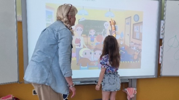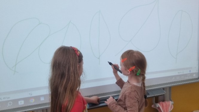 Tentokrát jsme trénovali krátké, rovné i prohnuté šikmé čáry. Povídali jsme si o lese i o našem národním stromu - lípě. Zahráli jsme si hru na interaktivní tabuli, při které měly děti za úkol hledat předměty na obrázku třídy, dle pokynů. Hra děti velmi bavila.