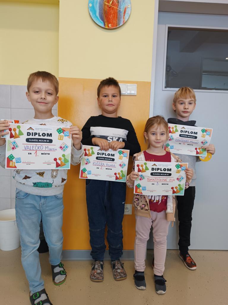 V týdnu 20. - 24. 11. proběhla třídní kola 1. a 2. tříd v soutěži Člověče, nezlob se. Vítězové postoupili do finále, které se konalo v úterý 5. 12. Po napínavém souboji zvítězil Martin VALEČKO z 2. B.