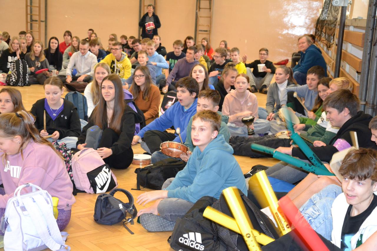 Celý 2. stupeň se sešel v tělocvičně školy a všichni si přinesli něco, na co se dá bubnovat. A tak jsme mohli vidět nejen bubny, kachony, ale i celou škálu bicích nástrojů, k tomu další předměty jako kelímky, misky či hrnce a další.