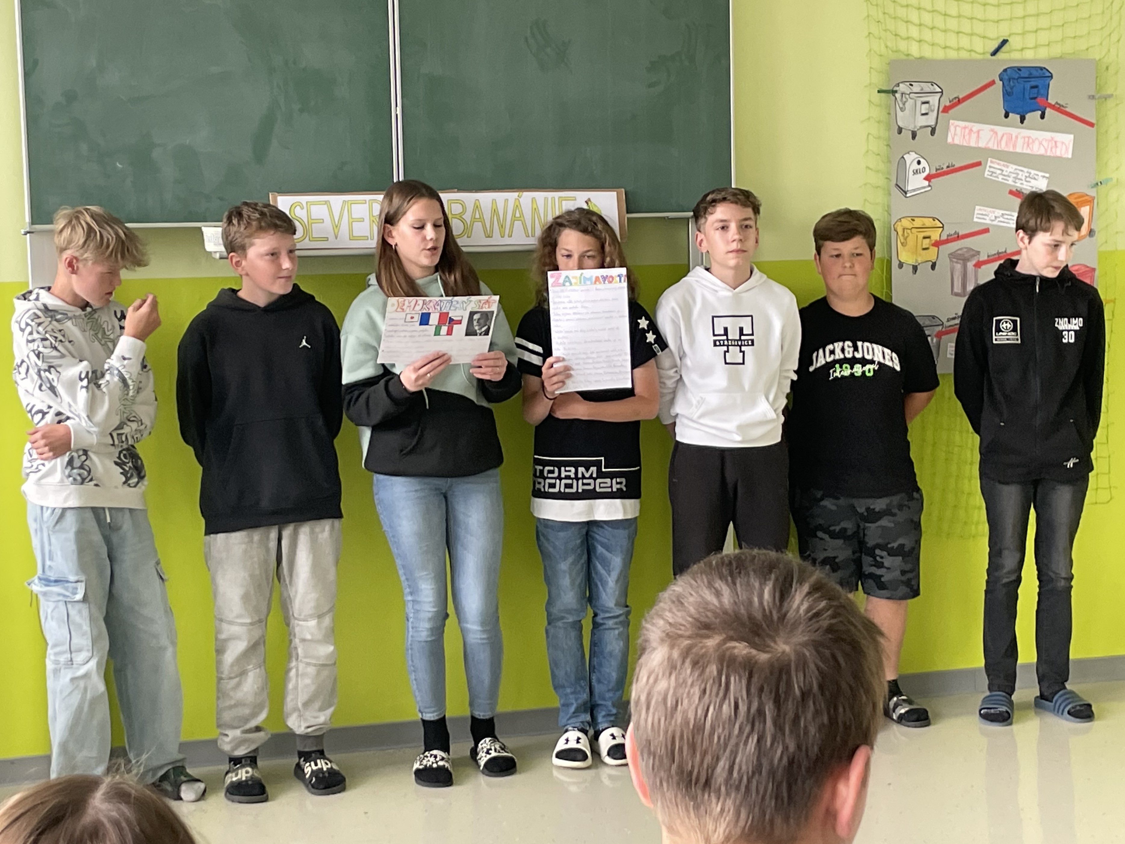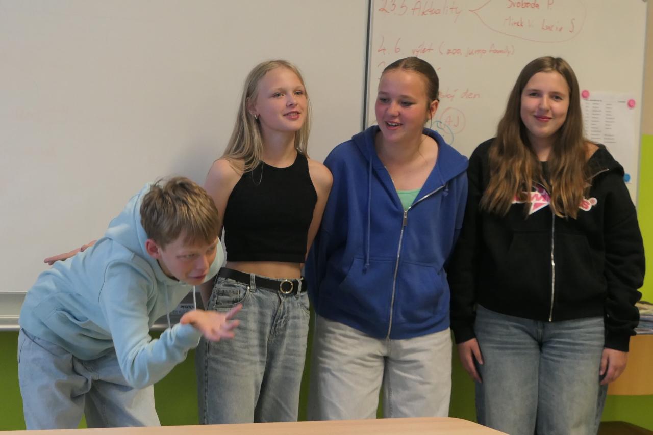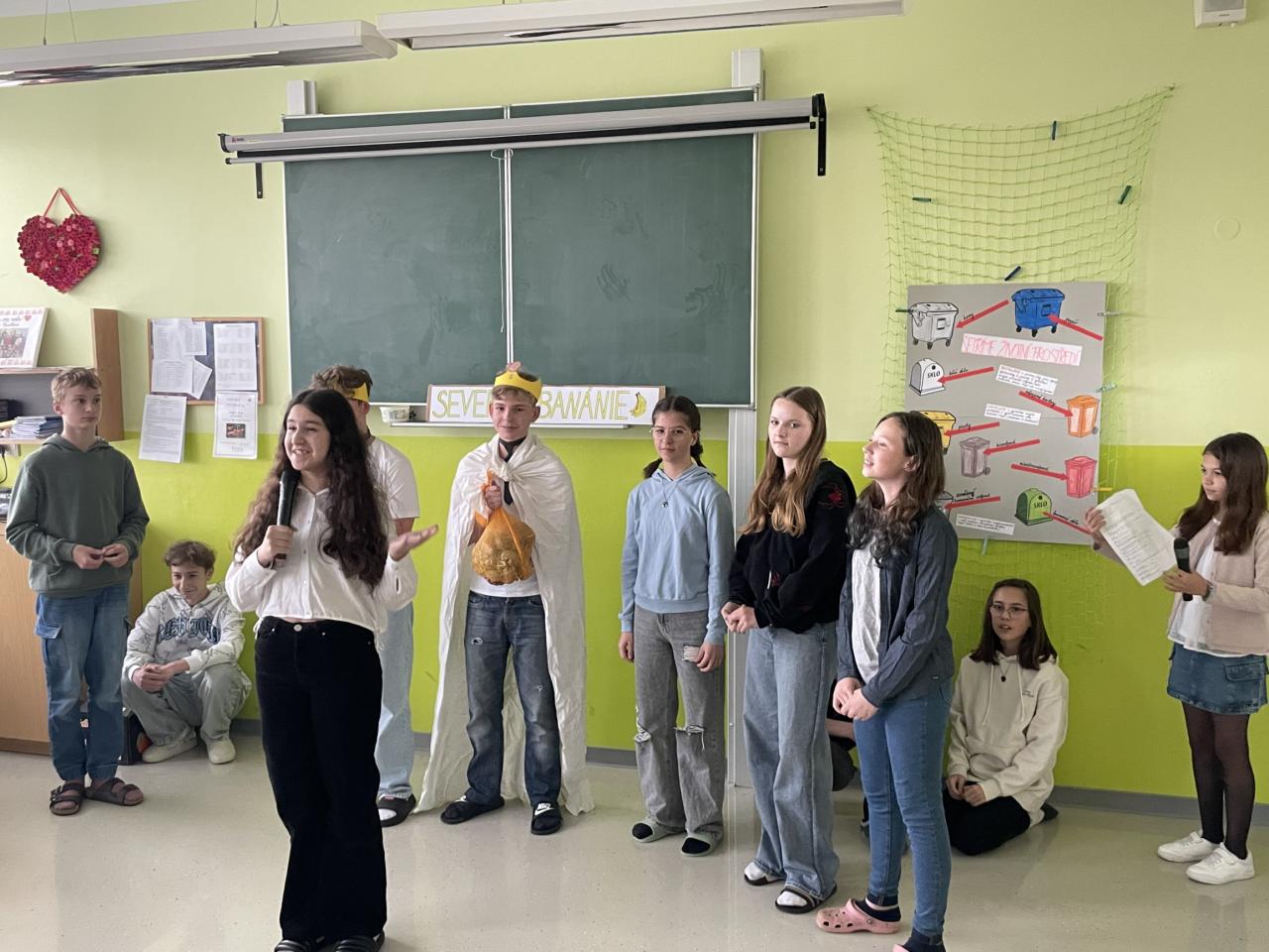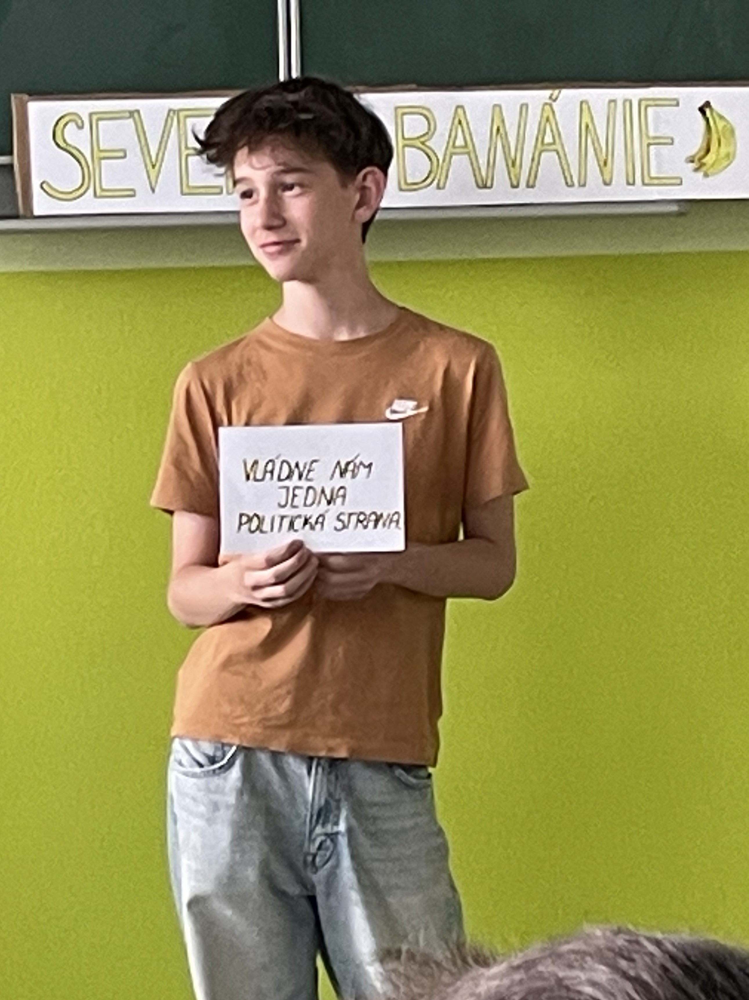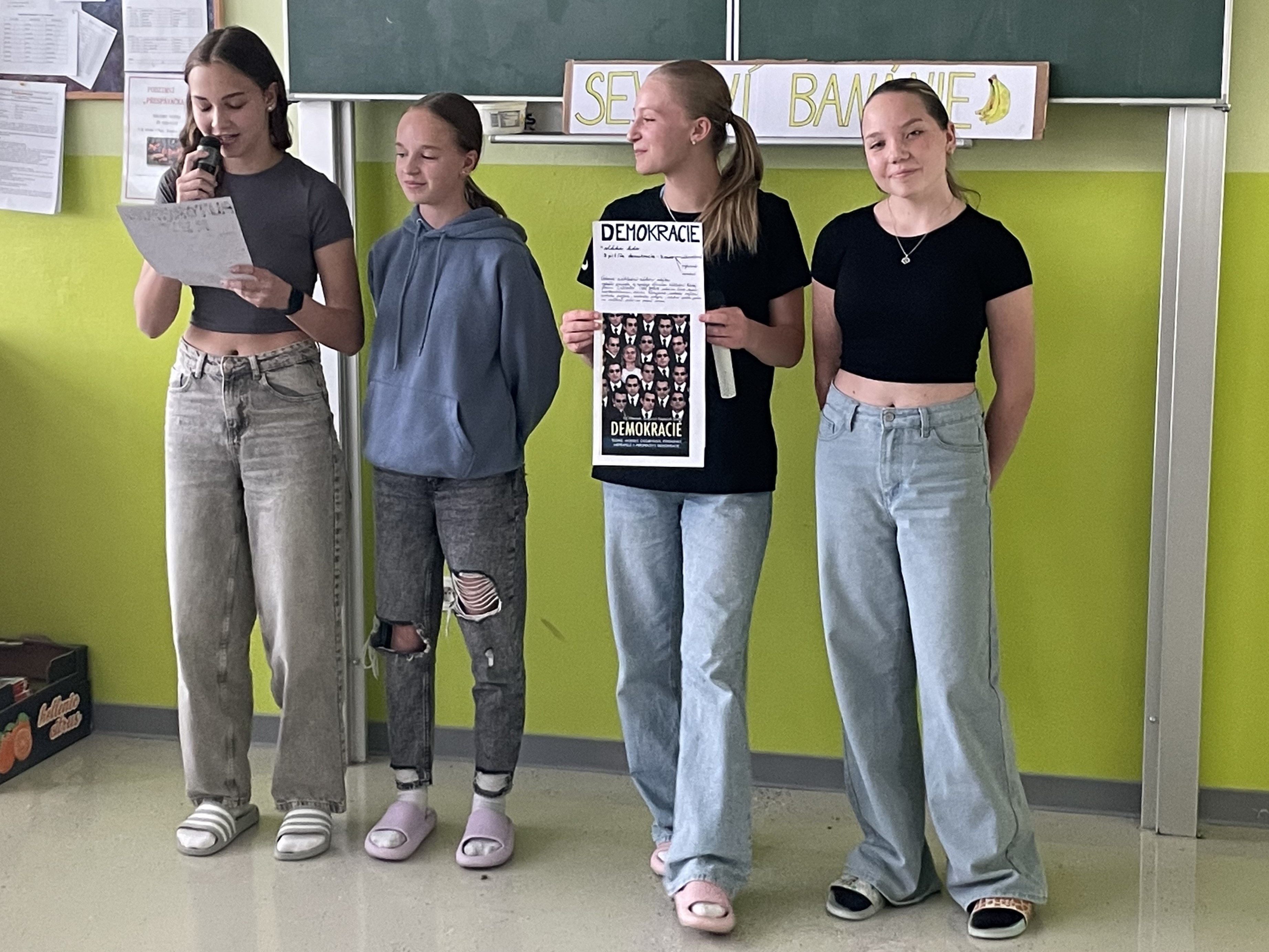 přiřazovali různé výroky k jednomu z režimů. Třída 7. B na téma nahlédla kreativně – vymysleli si imaginární zemi Severní Banánie a sehráli scénku, která trefně a s nadhledem vystihla znaky totalitního režimu. Projekt žákům umožnil lépe pochopit rozdíly mezi oběma typy vládnutí a zapojit při tom vlastní tvořivost i kritické myšlení.