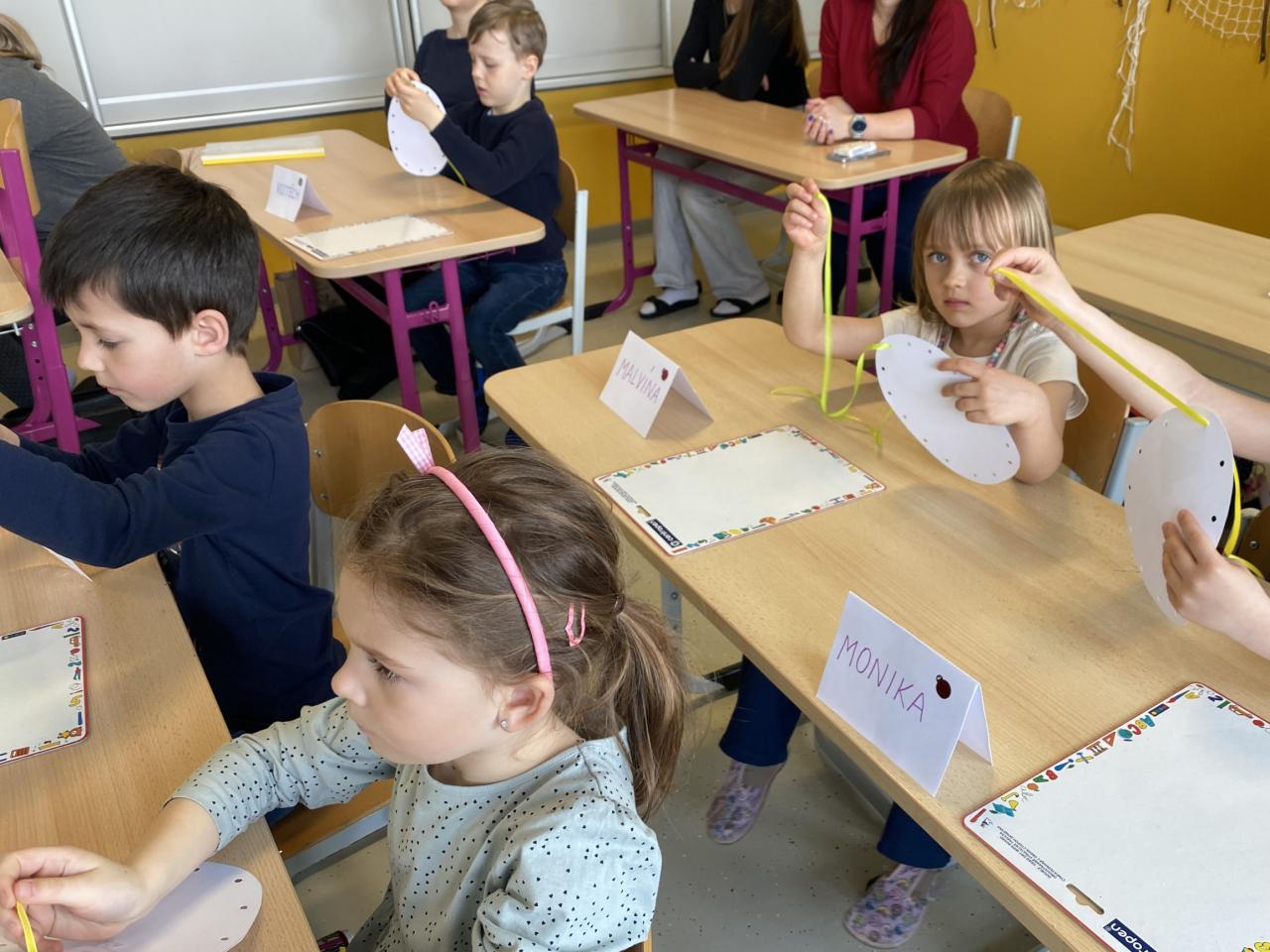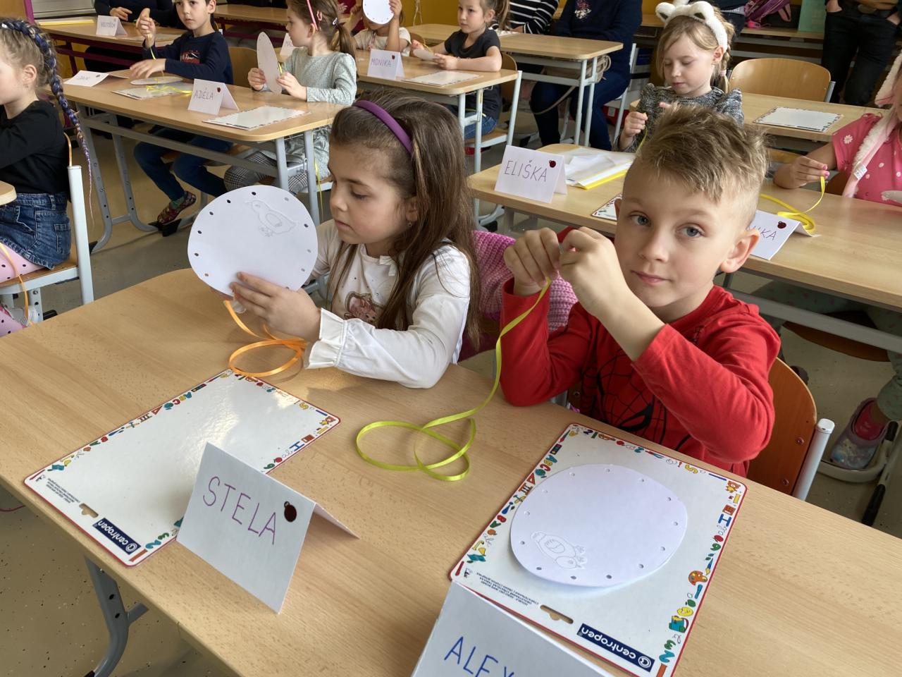 provlékali jsme stuhu vajíčkem a trénovali tak jemnou motoriku. Na pracovním listu,